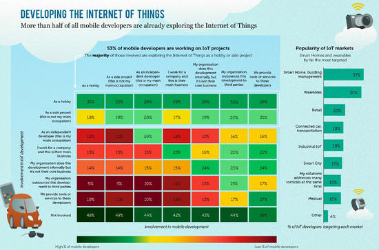 虽然物联网平台还不成熟,但移动开发者们对其的兴趣却很高。53%的受访移动开发者已经致力于某种物联网项目。智能家居是最受欢迎的,37%的移动开发者正在开发这方面的项目。可穿戴设备也很受欢迎,希望从事这方面的开发者占35%。