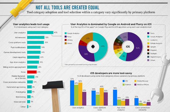工具认知度正在增长,完全不使用第三方工具的开发人员降至最低点,17%。第二受欢迎的工具种类是广告网络,采用率达到30%,遗憾的是这类工具和收入无关。