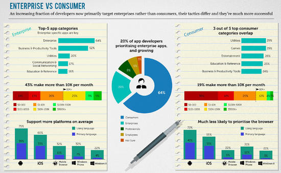 企业应用正迎来黄金时期,20%的开发者主要针对企业开发应用,和2014年第三季度的16%比有所上升。焦点转移初显成效,43%的企业应用开发者每个月收入超过1万美元,相比之下,只有19%的消费级应用开发者达到了这一收入水平。