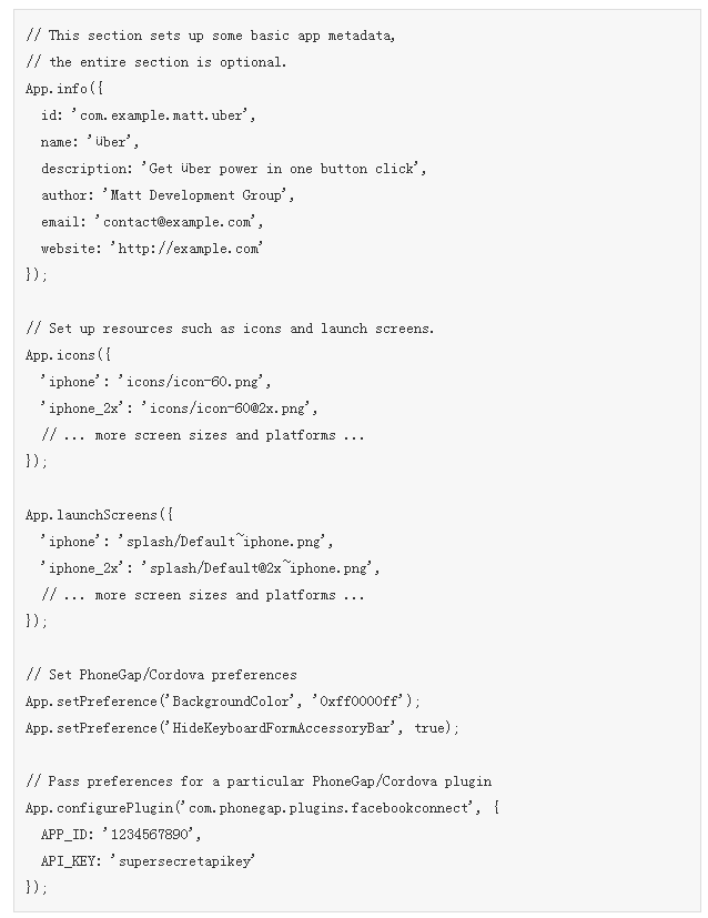 在项目文件夹中,创建一个mobile-config.js文件。在该文件中,我们可以为应用的移动部分设置一组配置选项,包括: