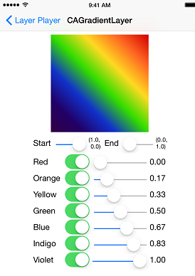 CAGradientLayer简化了混合两种或更多颜色的工作,尤其适用于背景。要配置渐变色,你需要分配一个CGColor数组,以及标识渐变图层起止点的startPoint和endPoint。