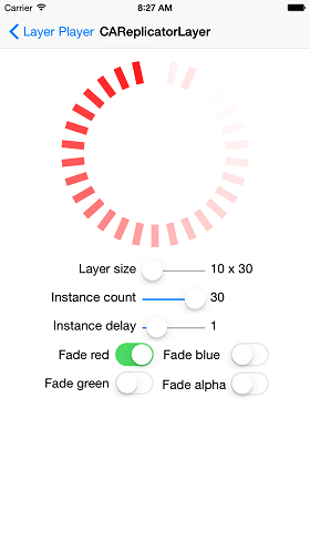 // 1 let replicatorLayer = CAReplicatorLayer() replicatorLayer.frame = someView.bounds // 2 replicatorLayer.instanceCount = 30 replicatorLayer.instanceDelay = CFTimeInterval(1 / 30.0) replicatorLayer.preservesDepth = false replicatorLayer.instanceColor = UIColor.whiteColor().CGColor // 3 replicatorLayer.instanceRedOffset = 0.0 replicatorLayer.instanceGreenOffset = -0.5 replicatorLayer.instanceBlueOffset = -0.5 replicatorLayer.instanceAlphaOffset = 0.0 // 4 let angle = Float(M_PI * 2.0) / 30 replicatorLayer.instanceTransform = CATransform3DMakeRotation(CGFloat(angle), 0.0, 0.0, 1.0) someView.layer.addSublayer(replicatorLayer) // 5 let instanceLayer = CALayer() let layerWidth: CGFloat = 10.0 let midX = CGRectGetMidX(someView.bounds) - layerWidth / 2.0 instanceLayer.frame = CGRect(x: midX, y: 0.0, width: layerWidth, height: layerWidth * 3.0) instanceLayer.backgroundColor = UIColor.whiteColor().CGColor replicatorLayer.addSublayer(instanceLayer) // 6 let fadeAnimation = CABasicAnimation(keyPath: "opacity") fadeAnimation.fromValue = 1.0 fadeAnimation.toValue = 0.0 fadeAnimation.duration = 1 fadeAnimation.repeatCount = Float(Int.max) // 7 instanceLayer.opacity = 0.0 instanceLayer.addAnimation(fadeAnimation, forKey: "FadeAnimation") |