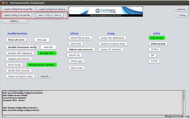 How it works – an overview 安卓运行时在代码关键部分配置了许多钩子,这些构造寻找一个叫做Reframeworker.xml的文件,该文件位于/data/system。在每个应用运行时,每当一个被勾住的运行时方法被调用,都会与包含的规则("items")一起加载ReFrameworker的配置文件,并作出相应的反应。 与它的规则一起管理配置文件已经通过ReFrameworker dashboard做到,使用面板,你可以定义一系列Android运行时会遵从的规则。米那般将会生成一个配置文件,运行时环境将随后解析并执行。 例如,它随着加载一个可以是本地、也可以是直连安卓设备上的配置文件一起启动。在点击load config按钮后,面板将会标记所有加载的规则,并允许用户enable/disable或者配置它们、