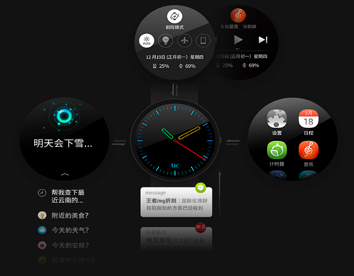 智能手表引导用户更多地使用语音和手势的交互方式。语音和手势交互在手机平台上也都是有的,但都没有得到充分的运用。手机上较为便利的文字输入使得语音显得不那么重用,而手机的手持方式也不如手表更适合手势操作。另一方面,手表上文字输入的不便也使得新的交互方式成为必然,而这也为开发者提供了一个广阔的舞台。为了便利开发者二次开发,除了通信、传感器系统接口,Ticwear更是开放了语音识别、语义分析、移动搜索接口。
