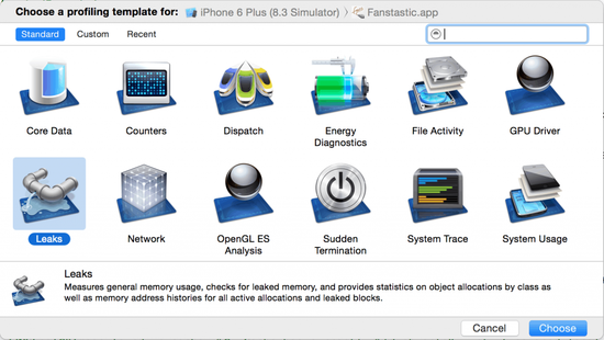 不管我如何努力避免Retain Cycle,忘记去引入一个弱引用并意外地创建一个(多谢ARC!)这样的事情迟早还有发生。幸运的是XCode套件中的Instruments应用程序是很不错的工具,用于检测和定位Retain Cycle。一旦开发阶段结束,在提交苹果商店之前就分析(profile)你的应用是个不错的习惯。Instruments有很多模版用来分析应用的不同方面,但我们感兴趣的是“Leaks”选项。