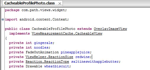 恩恩,看来就是他了,作为一个继承于ImageView的家伙,果断直接看OnDraw方法。[常人是无法忍受path这满地都是食物名称为变量的反编代码.坑爹啊]