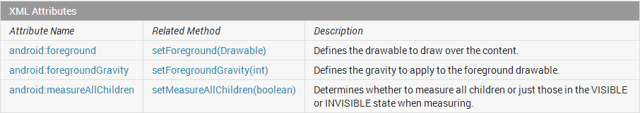 更多详细信息可以查看谷歌大神文档:http://developer.android.com/reference/android/widget/FrameLayout.html