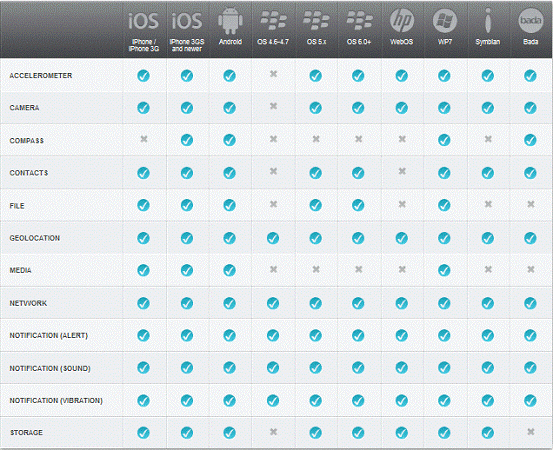 once, run everywhere”而兼容性越强,所需的开发成本越低。目前 PhoneGap 对不同平台提供的功能特性有一定的差别,如图