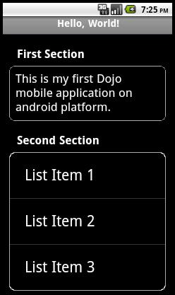 <div dojoType="dojox.Mobile.View" selected="true"> <h2 dojoType="dojox.Mobile.Heading" fixed="top">Hello, World!</h2> <h2 dojoType="dojox.Mobile.RoundRectCategory">First Section</h2> <div dojoType="dojox.Mobile.RoundRect"> This is my first dojo Mobile application on android platform. </div> <h2 dojoType="dojox.Mobile.RoundRectCategory">Second Section</h2> <ul dojoType="dojox.Mobile.RoundRectList"> <li dojoType="dojox.Mobile.ListItem">List Item 1</li> <li dojoType="dojox.Mobile.ListItem">List Item 2</li> <li dojoType="dojox.Mobile.ListItem">List Item 3</li> </ul> </div> |
