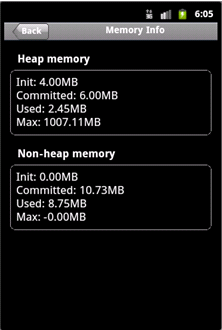 <div dojoType="dojox.Mobile.View" id="propertyList"> <h1 dojoType="dojox.Mobile.Heading" back="Back" moveTo="query">JVM Status</h1> <ul dojoType="dojox.Mobile.EdgeToEdgeList"> <li dojoType="dojox.Mobile.ListItem" moveTo="vmInfo" transition="slide" onclick="flags.vm=true;viewVMInfo();">VM Info</li> <li dojoType="dojox.Mobile.ListItem" moveTo="mmInfo" transition="slide" onclick="flags.mm=true;viewMMInfo();">Memory Info</li> <li dojoType="dojox.Mobile.ListItem" moveTo="thInfo" transition="slide" onclick="flags.th=true;viewTHInfo();">Thread Info</li> <li dojoType="dojox.Mobile.ListItem" moveTo="clInfo" transition="slide" nclick="flags.cl=true;viewCLInfo();">Class Loader Info</li> <li dojoType="dojox.Mobile.ListItem" moveTo="gcInfo" transition="slide" onclick="flags.gc=true;viewGCInfo();">Garbage Collection Info</li> </ul> </div> |