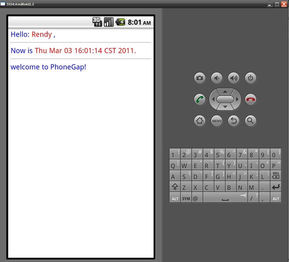 <!DOCTYPE HTML> <html> <head> <meta name="viewport" content="width=320; user-scalable=no" /> <meta http-equiv="Content-type" content="text/html; charset=utf-8" > <title>PhoneGap</title> <link rel="stylesheet" href="master.css" type="text/css" media="screen" title="no title" charset="utf-8" > <script type="text/javascript" charset="utf-8" src="phonegap.0.9.4.js" ></script> <script type="text/javascript" charset="utf-8" > //show device information var deviceInfo = function (){ document.getElementById("platform").innerHTML = device.platform; document.getElementById("version").innerHTML = device.version; document.getElementById("uuid").innerHTML = device.uuid; document.getElementById("name").innerHTML = device.name; document.getElementById("width").innerHTML = screen.width; document.getElementById("height").innerHTML = screen.height; document.getElementById("colorDepth").innerHTML = screen.colorDepth; }; //listen the device ready event and get the device information. function init(){ document.addEventListener("deviceready", deviceInfo, true ); }