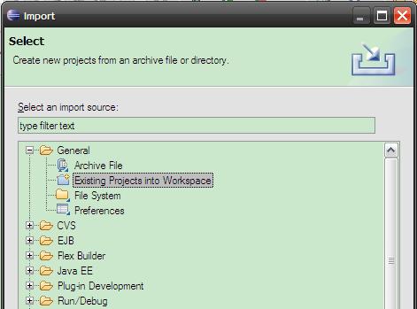 下载代码到本地计算机,打开 Eclipse,点击 File->import->Existing
