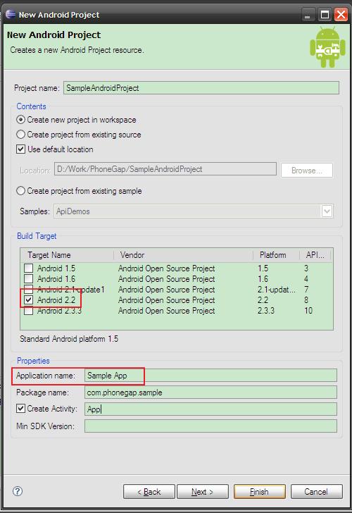 会弹出窗口让你选择合适的 AVD,如果还没有配置,请参照“搭建 PhoneGap 开发环境”小节介绍的方法创建一个