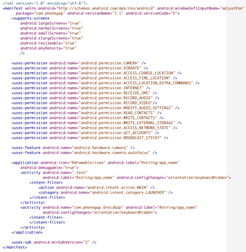 <supports-screens android:largeScreens="true" android:normalScreens="true" android:smallScreens="true" android:resizeable="true" android:anyDensity="true" /> <uses-permission android:name="android.permission.CAMERA" /> <uses-permission android:name="android.permission.VIBRATE" /> <uses-permission android:name="android.permission.ACCESS_COARSE_LOCATION" /> <uses-permission android:name="android.permission.ACCESS_FINE_LOCATION" /> <uses-permission android:name="android.permission.ACCESS_LOCATION_EXTRA_COMMANDS" /> <uses-permission android:name="android.permission.READ_PHONE_STATE" /> <uses-permission android:name="android.permission.INTERNET" /> <uses-permission android:name="android.permission.RECEIVE_SMS" /> <uses-permission android:name="android.permission.RECORD_AUDIO" /> <uses-permission android:name="android.permission.MODIFY_AUDIO_SETTINGS" /> <uses-permission android:name="android.permission.READ_CONTACTS" /> <uses-permission android:name="android.permission.WRITE_CONTACTS" /> <uses-permission android:name="android.permission.WRITE_EXTERNAL_STORAGE" />