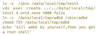 这段命令首先创建了一个指向/sbin的符号链接/data/local/tmp/test1。然后使用vdc向vold发送触发漏洞的消息,vold将会把/data/app-sec/../../data/local/tmp/test1 mount起来。因为/data/local/tmp/test1是/sbin的符号链接,所以/sbin目录被覆盖成一个空分区。这个空分区是不可写入的,但我们能在该分区内建立符号链接,因此我为/data/local/tmp/adbd建立了一个符号链接是/sbin/adbd。这样一来,/sbin/adbd就指向了一个我们可控的文件:/data/local/tmp/adbd。当adbd进程被杀死,init进程将重新启动adbd,/data/local/tmp/adbd以root权限运行。后面要做的就是为手机安装su程序了,至此,手机root的过程完成。 |