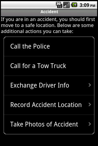 <body> <!-- ACCIDENT TOOLKIT PAGE --> <div dojoType="dojox.mobile.View" id="accHelp" selected="true"> <h1 dojoType="dojox.mobile.Heading">Accident</h1> <div class="text">If you are in an accident, you should first move to a safe location. Below are some additional actions you can take:</div> <ul dojoType="dojox.mobile.RoundRectList"> <li dojoType="dojox.mobile.ListItem" onclick="window.location='geo:0,0?q=police';">Call the Police</li> <li dojoType="dojox.mobile.ListItem" onclick="window.location='geo:0,0?q=towing';">Call for a Tow Truck</li> <li dojoType="dojox.mobile.ListItem" moveTo="accInfo" transition="slide" onClick="itemClicked();">Exchange Driver Info</li> <li dojoType="dojox.mobile.ListItem" moveTo="accInfo" transition="slide" onClick="itemClicked();">Record Accident Location</li> <li dojoType="dojox.mobile.ListItem" moveTo="accInfo" transition="slide" onClick="itemClicked();">Take Photos of Accident</li> </ul> </div> <!-- EXCHANGE DRIVER INFO PAGE --> <div dojoType="dojox.mobile.View" id="accInfo"> <h1 dojoType="dojox.mobile.Heading" back="Accident" moveTo="accHelp" onClick="console.log('Going back');">Driver</h1> <h2 dojoType="dojox.mobile.RoundRectCategory">Other Driver Info</h2> </div> </body> |