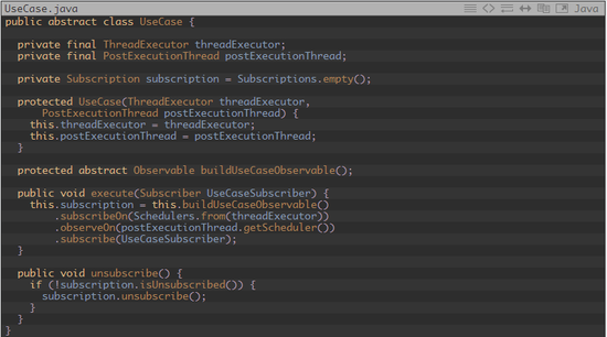 正如你所看到的,所有用例继承这个抽象类,并实现抽象方法buildUseCaseObservable()。该方法将建立一个Observables<T>,它承担了繁重的工作,还要返回所需的数据。