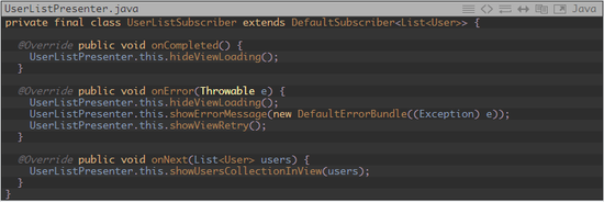 到目前为止,我们的Observables<T>启动并且运行了。但是,正如你所知,必须要观察它所发出的数据序列。要做到这一点,我改进了presenters(MVP模式表现层的一部分),把它变成了观察者(Subscribers),它通过用例对发出的项目做出“react”,以便更新用户界面。