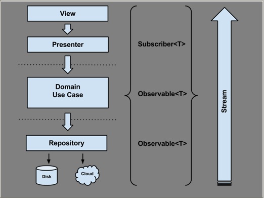 首先,我选择了一种响应式的模式通过转换usecase(在这个清晰的架构命名规则中,其被称为interactor)返回Observables<T>,表示所有底层都遵循这一链条,也返回Observables<T> 。