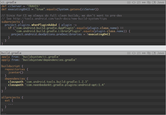 因此,你可以用“apply from: ‘buildsystem/ci.gradle’”插入到任何Gradle建立的文件中进行配置。不要把所有都放置在一个build.gradle文件中,否则就是去创建一个怪物,这是教训。