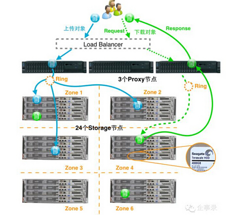 Swift集群的架构让我们可以很容易地扩展Proxy节点和存储节点的数量。一个中等规模Swift部署的例子如图所示: