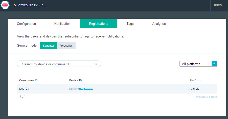 Push 服务,并导航到 Registrations 选项卡。可以在该列表中看到您的设备。您可以注意到,Consumer