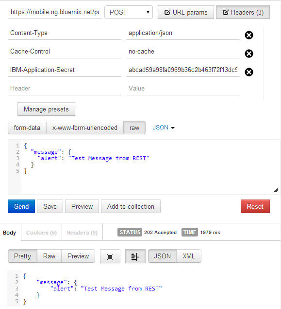 2.将 URL 设置为: https://mobile.ng.bluemix.net/push/v1/apps/YOUR-APPID/messages