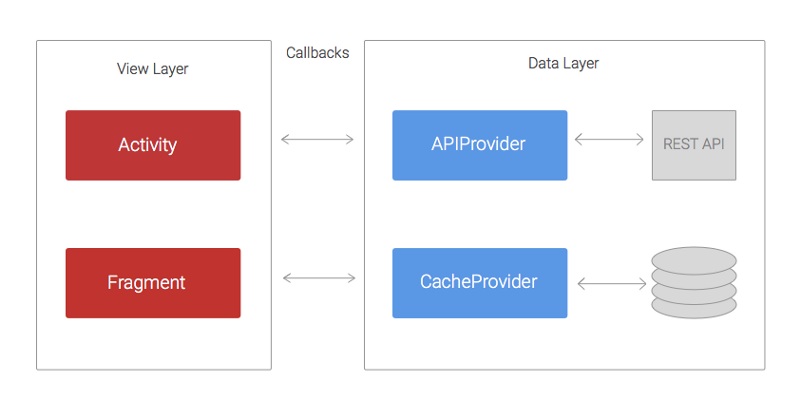 代码共分两层:控制从REST API检索/保存数据的数据层(data layer),还有负责在UI上控制与展示数据的视图层(view layer)。 APIProvider提供方法,让Activities和Fragments能够很容易地与REST API交互。运用URLConnection和AsyncTasks来执行单独线程中的网络调用,并通过回调向Activities返回结果。 类似地,CacheProvider包含了从SharedPreferences或SQLite数据库检索存储数据的方式,通过回调将结果返回给Activities。