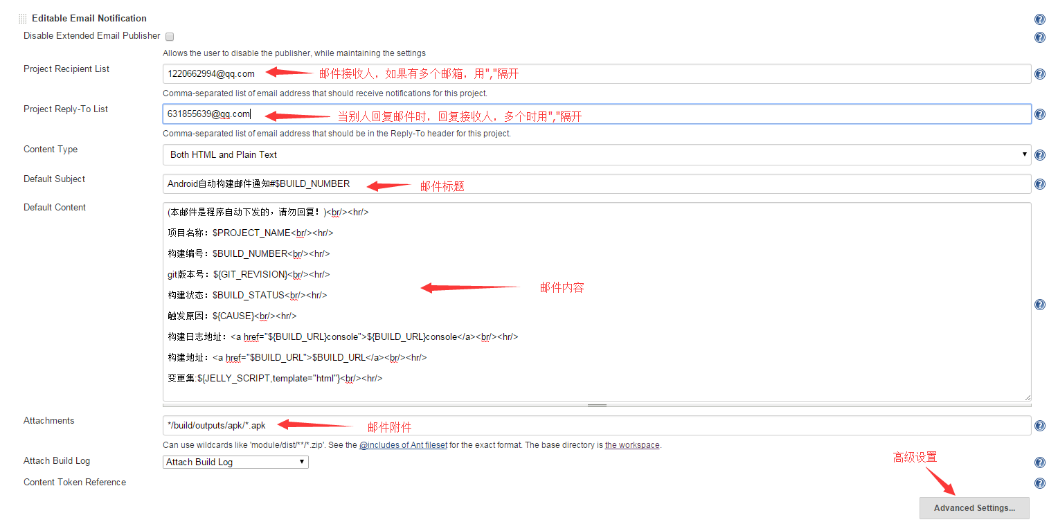 高级设置,配置了,任何构建失败的时候,通过邮件通知开发者,构建成功的时候,邮件通知相关人。