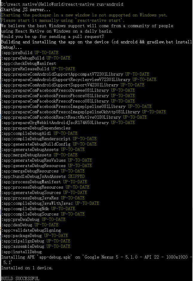 在命令行执行完毕之后,我们会看到To run your app on Android的提示。进入到HelloWorld文件夹,执行命令: