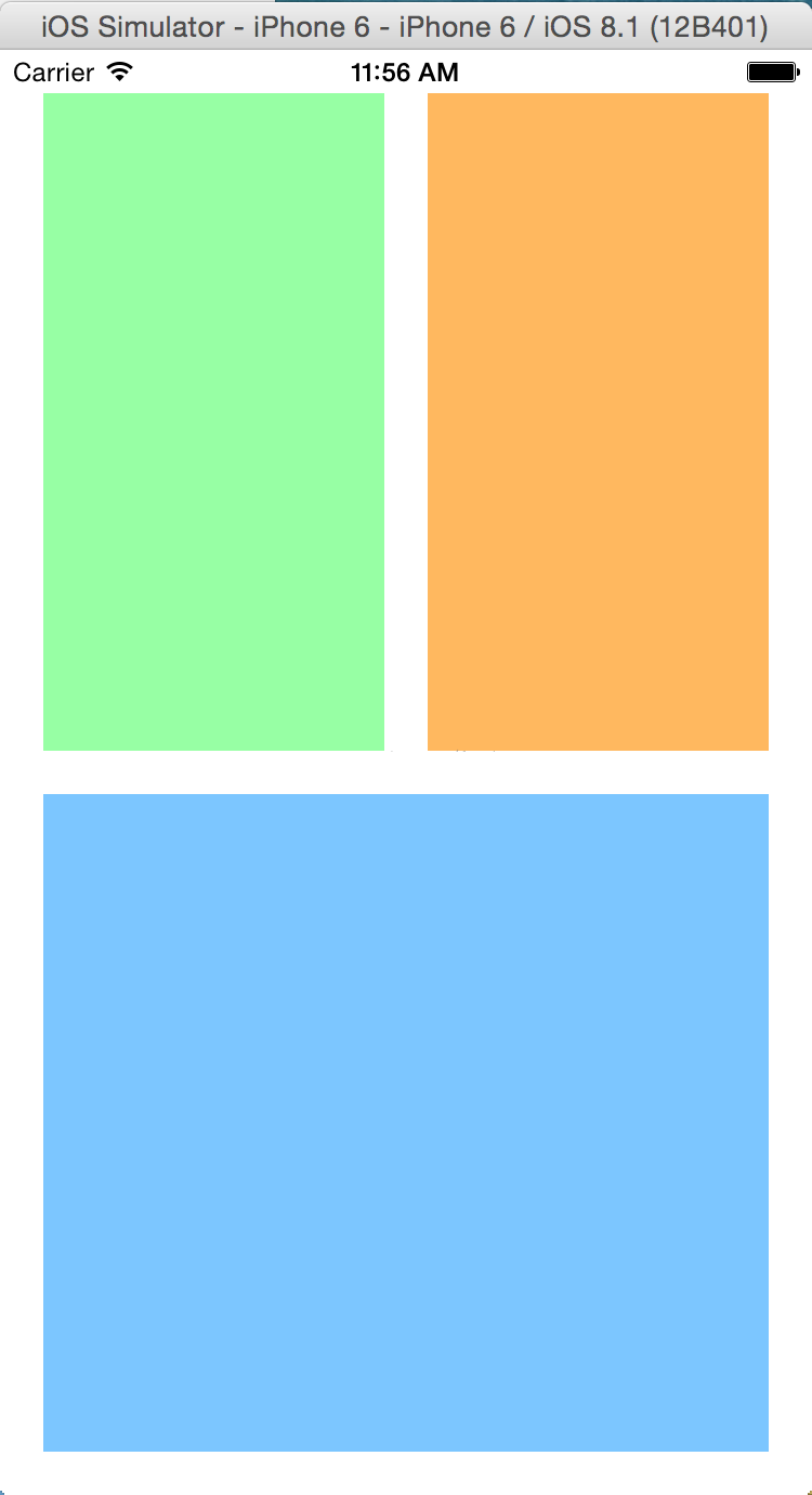 例子2:通过上边例子我们实现一个简单的UI布局,下面来一个稍微复杂点的,把上一篇中提到3个view布局的那个例子用代码布局实现一下,但难度有所增加,当size