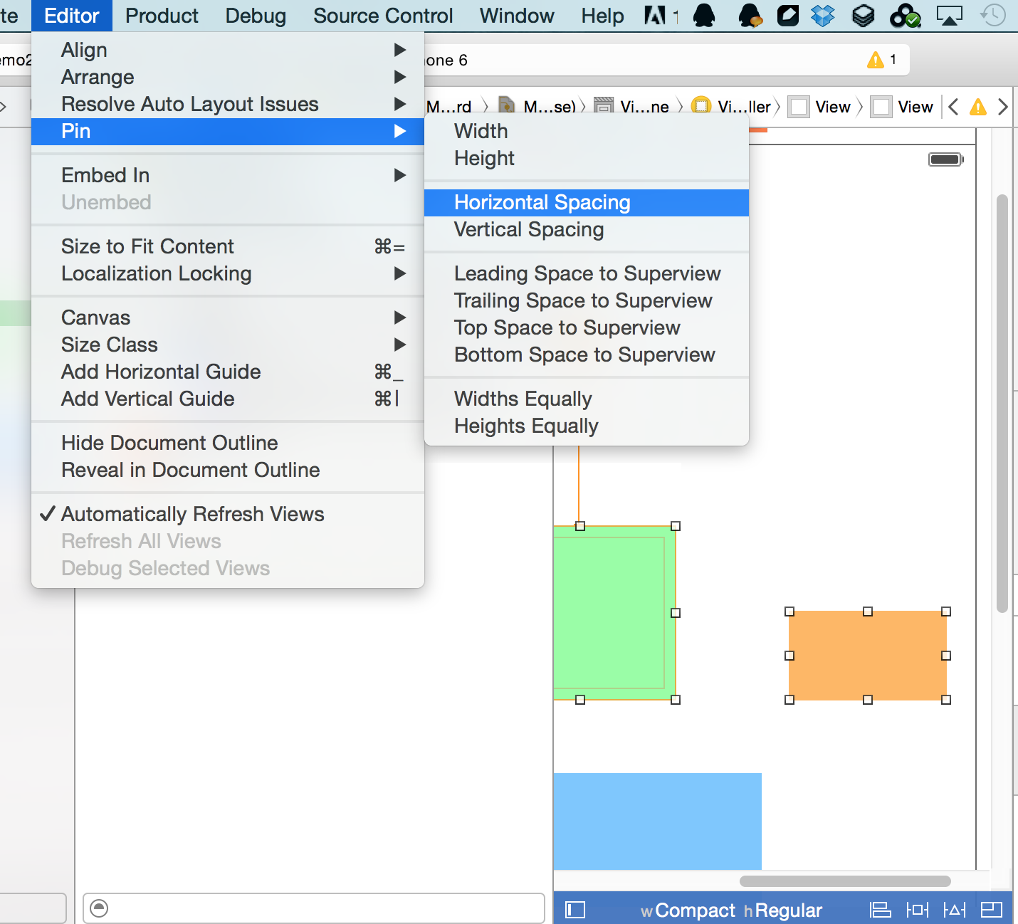 添加绿色view与黄色view之前的距离时候,由于是设定两个子view的constraint,所以要选中两个view,然后Editor->Pin