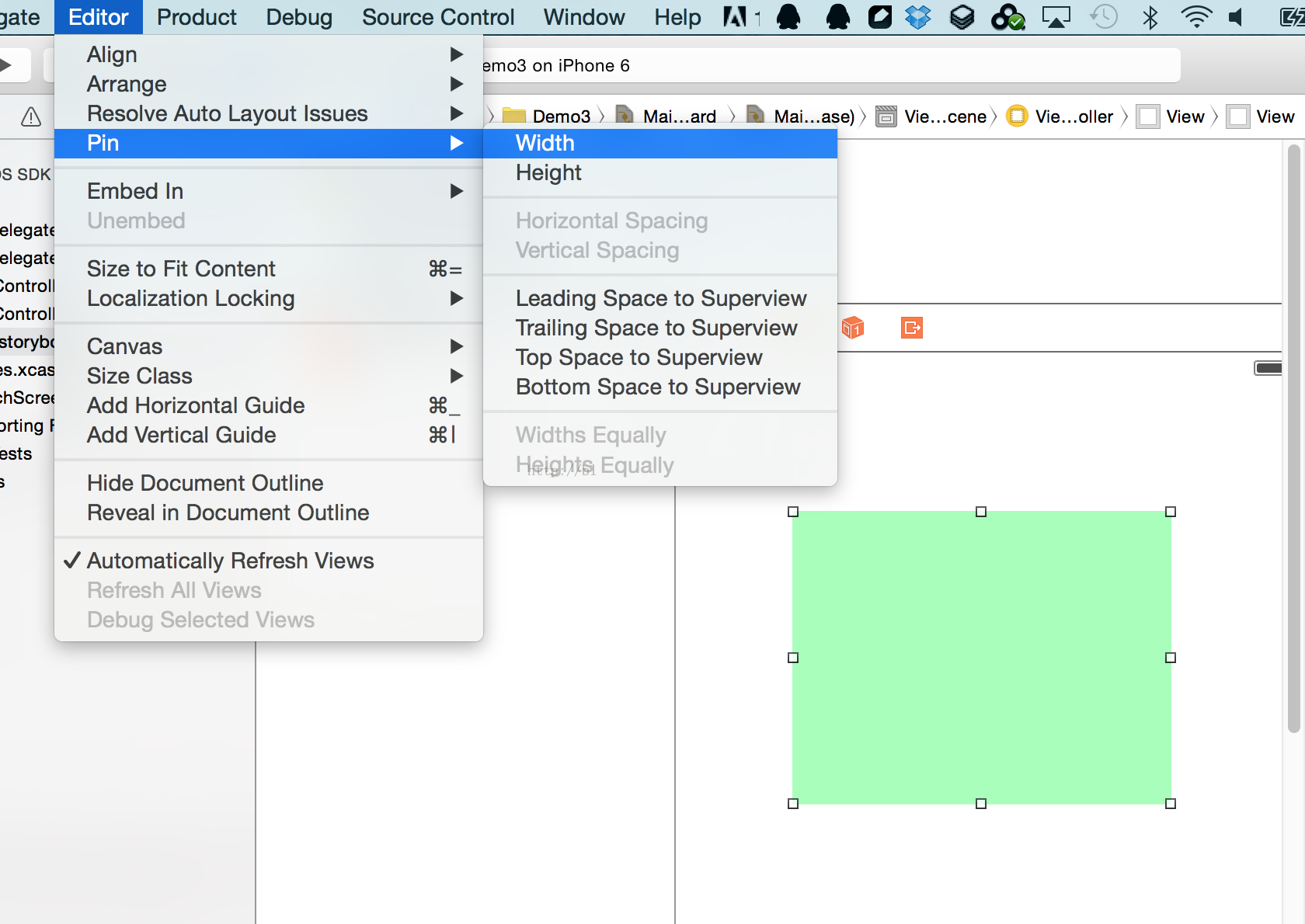 现在开始动手吧:选中绿色view,Eidtor->Pin->Leading