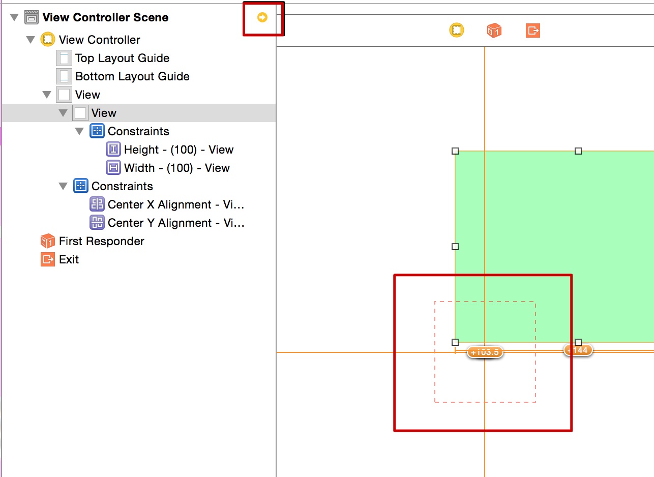 蓝色框部分时添加的constraint,目前为黄色线,表明当前的constraint还不能定位view,当一个view的constraint正确的时候,constraint的颜色会变为蓝色。