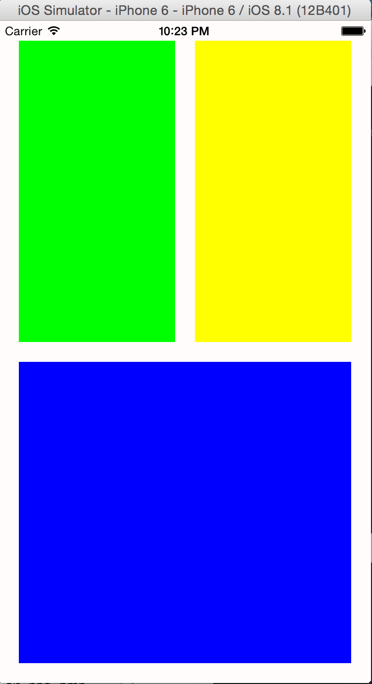 [yellowView(==greenView)]-20-|" options:0 metrics:nil 7. views:NSDictionaryOfVariableBindings(greenView, yellowView)]]; 8. 9. [constraintArray addObjectsFromArray:[NSLayoutConstraint 10. constraintsWithVisualFormat:@"V:|-20-[blueView]-20-