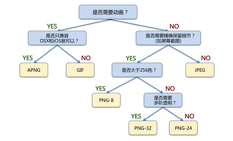 其中APNG和WebP格式出现的较晚,尚未被Web标准所采纳,只有在特定平台或浏览器环境可以预知的情况下加以采用,虽然均可以在不支持的环境中较好的功能降级,但本节暂不讨论这两种格式。图片格式选择过程如下: