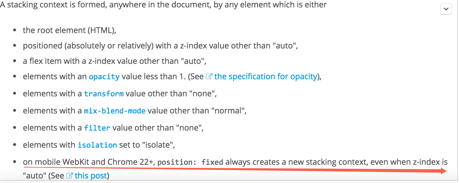 红线部分说的就是移动端webkit的浏览器和chrome22+的浏览器,position:fixed的时候也会创建一个层叠上下文。这里面层叠上下文的概念很重要,z-index的相关内容很多,如果对z-index的使用不清楚,可先参考这篇文章:CSS