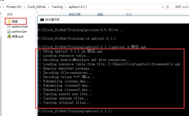 可以看到上图的反编译过程中打印信息日志,以及反编译成功后得到的微信目录。反编译成功后,进入微信目录可以看到如下的目录结构: