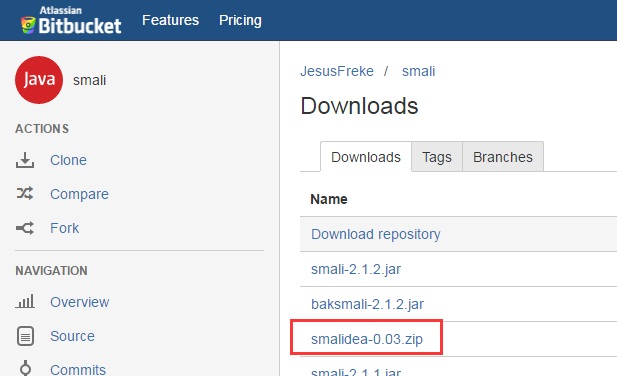 有兴趣想要了解 smali 语法的,可以看看这位作者写的文章:http://blog.isming.me/2015/01/14/android-decompile-smali/。看到这里你可能会想问,了解 smali 的语法有什么用呢?哈,非常简单粗暴,如果懂语法,就能读懂人家的应用里面的业务逻辑,还可以加以修改等。 再加上 Apktool 提供的调试 Smali 功能,可以玩得很爽。但是在 2.0.3 的版本上,作者已经宣布废弃此功能,到了 2.1 时此功能已经完全移除掉了。这也并不意味这我们无法玩转 smali 文件。感兴趣的童鞋可以直接玩耍下面这个 smali 调试插件: SmaliIdea: https://github.com/JesusFreke/smali/wiki/smalidea 反正我一看到 SmaliIdea 是震惊了。目前 SmaliIdea 最新的版本是 0.03,喜欢玩耍的童鞋可以到下面的下载地址中: https://bitbucket.org/JesusFreke/smali/downloads 找到最新版的 SmaliIdea 进行安装使用: