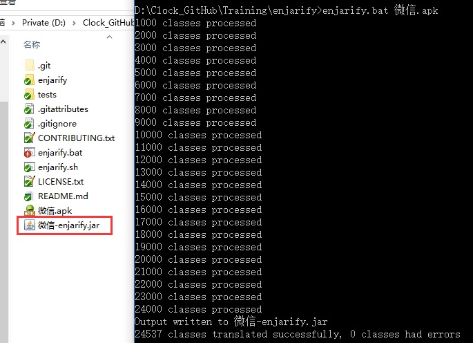 其他一些命令行很少用,喜欢折腾的童鞋,同样自行摸索。 继续拿微信开刀,解压 Apk 去除一个 dex 包,对其进行如下命令行操作: d2j-dex2jar.bat dex文件名
