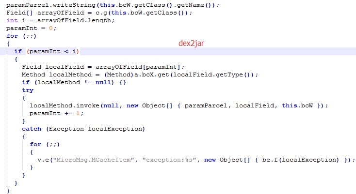 工具名: Procyon 源码: https://bitbucket.org/mstrobel/procyon 配置文档: 通过下载链接 https://bitbucket.org/mstrobel/procyon/downloads,下载 jar 包到本地即可。 使用文档: https://bitbucket.org/mstrobel/procyon/wiki/Java%20Decompiler 功能: 将反编译得到 jar 包还原成 java 文件,同时能够更强的还原代码的逻辑结构。 下面直接对比一下,即可看到 Procyon 的优势所在了。直接去到 Procyon 的目录下,并将 enjarify 反编译好的微信 jar 文件放置到同级目录,同时执行如下命令反编译整个 jar 包: