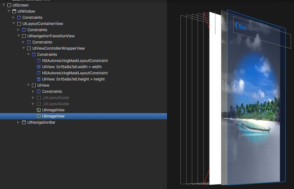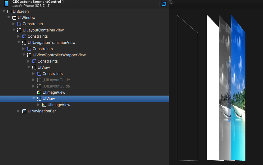 从下方的视图层级中我们不难看出,先贴一张黑白照,然后贴一个小的MaskView,在这个小的MaskView上在贴一张彩照,小MaskView的外的区域的彩照是看不见的。关键还在于,彩照的绝对坐标要与黑白照的绝对坐标完全重合,为了达到这个效果我们就采用了AutoLayout来实现的。下方会给出核心的实现代码。