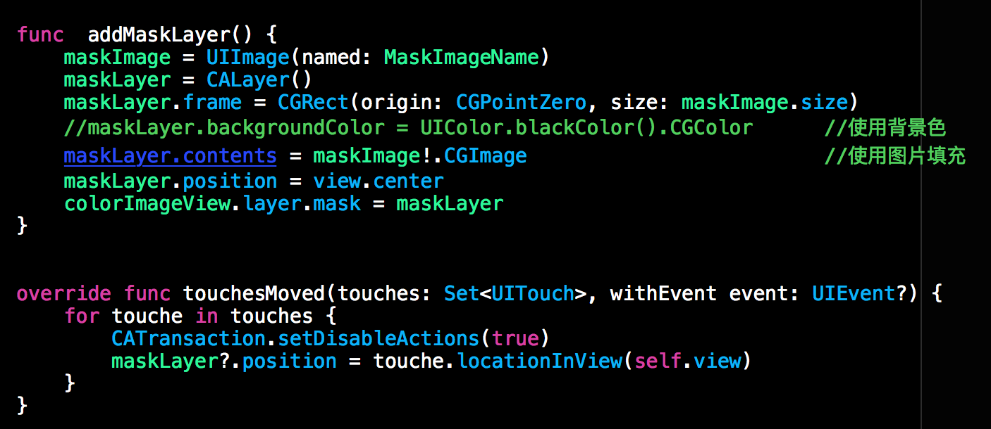 实现上述效果是比较简单的,下方就是上述效果的核心代码。关键还是给上面的ImageView添加Mask。下方代码就是给上方彩色的ImageView添加mask, 然后在touchesMoved事件中随着手指的移动来改变mask的位置即可。至此上述这个效果就使用mask实现完毕了。