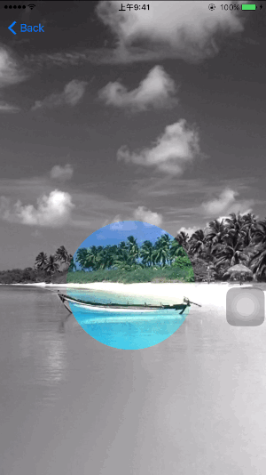 开门见山,下方这个效果就是我们接下来要实现的效果。圆框区域中显示的图片是彩色的,圆框外是黑白的。我们可以通过手指移动来变化彩色的区域。下方就是我们要实现的最终效果。