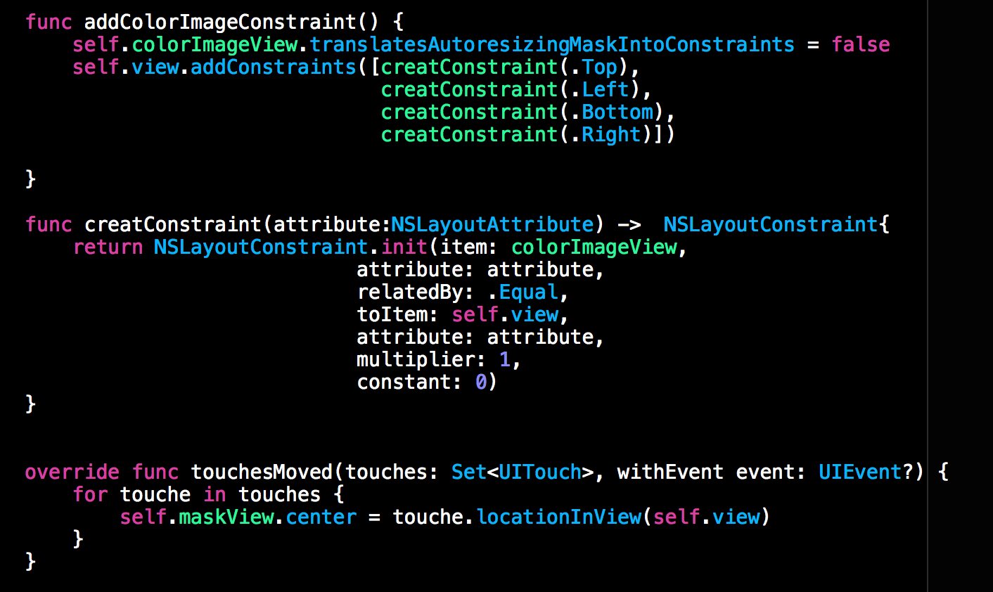 看完效果和视图层级后,接下来来看一下核心代码的实现,还是那句话核心代码就是AutoLayout的应用。下方代码就是上述效果的核心部分。colorImageView也就是我们的彩色图片是加在小的MaskView上的,也就是上面我们选中的View,不过其约束是添加在整个视图控制器的self.view上的。黑白照的约束也是self.view, 这样,彩照和黑白照就会重合。虽然彩照是在小的MaskView上,但是其约束是添加在self.view上的。所以你移动MaskView时,彩照的位置是不会随MaskView的位置改变而改变的。所以你就尽管在TouchesMoved事件中尽情的修改MaskView的坐标即可。