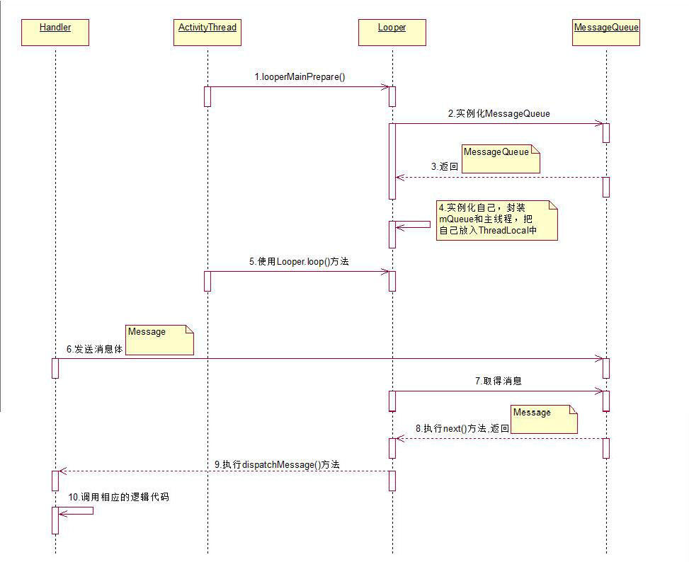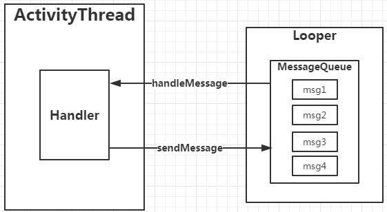 上面一共出现了几种类,ActivityThread,Handler,MessageQueue,Looper,msg(Message),对这些类作简要介绍: