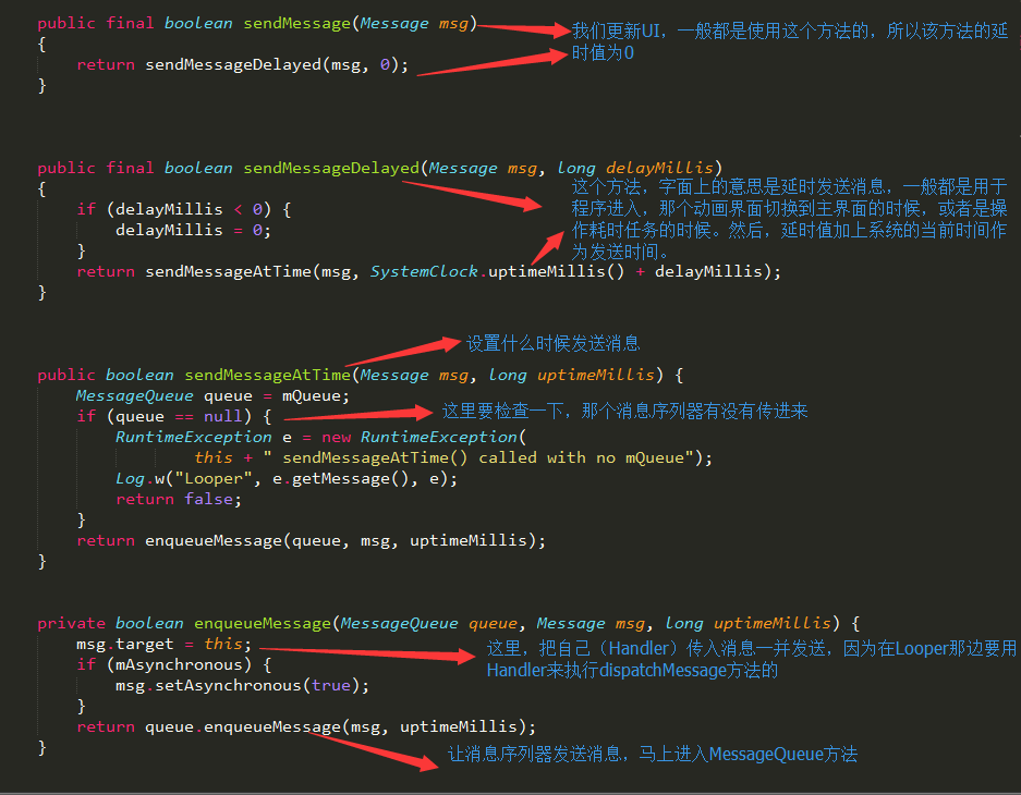 到这里为止,执行代码就结束了。那么问题来了,消息从哪里来的?带着这个疑问,我们马上进入Handler.sendMessage()逻辑去看看,其源码是: