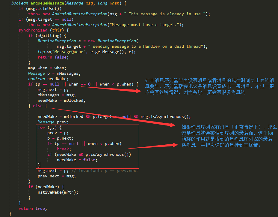 然后我们再到达MessageQueue.enqueueMessage()方法中看源码: