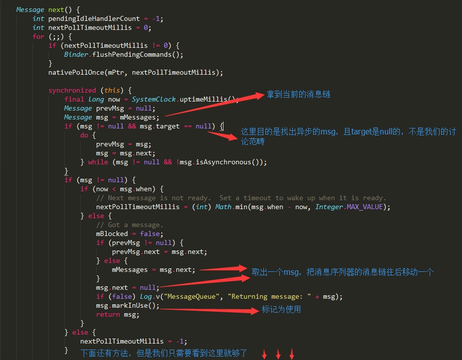 这个是发送消息的最终执行代码,就是把消息放进消息序列器。在Looper.loop()方法中,我们是需要不断从消息序列器中取出消息的。其过程也是我们可以进去MessageQueue.next()的源码中看看: