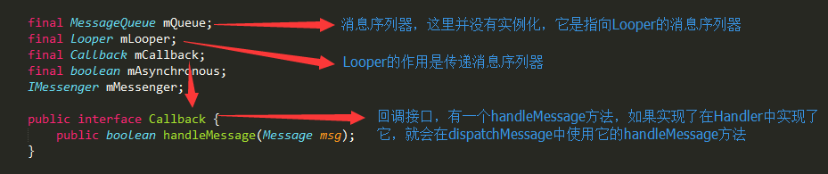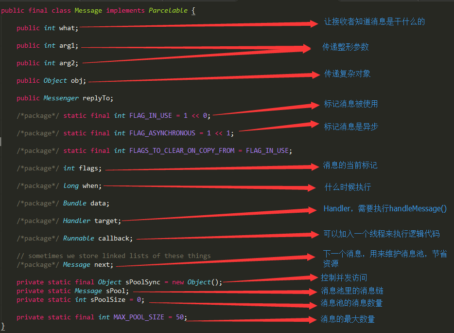 Message:这个类是封装消息体并被发送到MessageQueue中的,给类是通过链表实现的,其好处方便MessageQueue的插入和取出操作。还有一些字段是(int